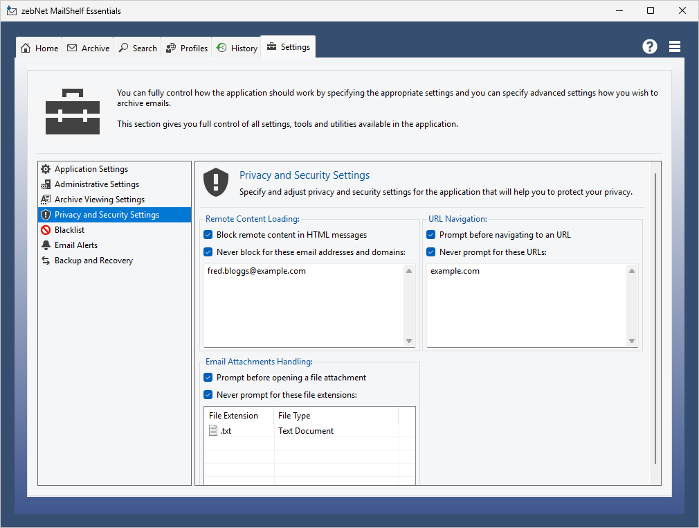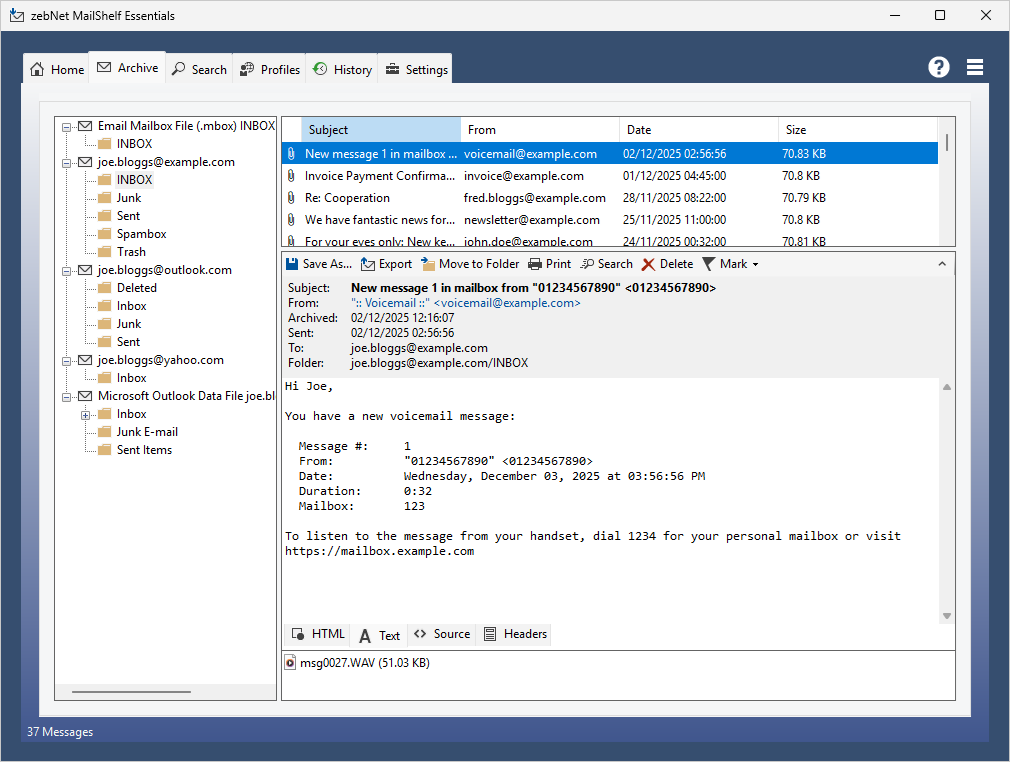 Have a look at the screenshots to get a first impression of what working with zebNet MailShelf Essentials looks like. Each image is only a thumbnail and you can click on an image to enlarge it.